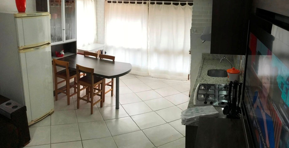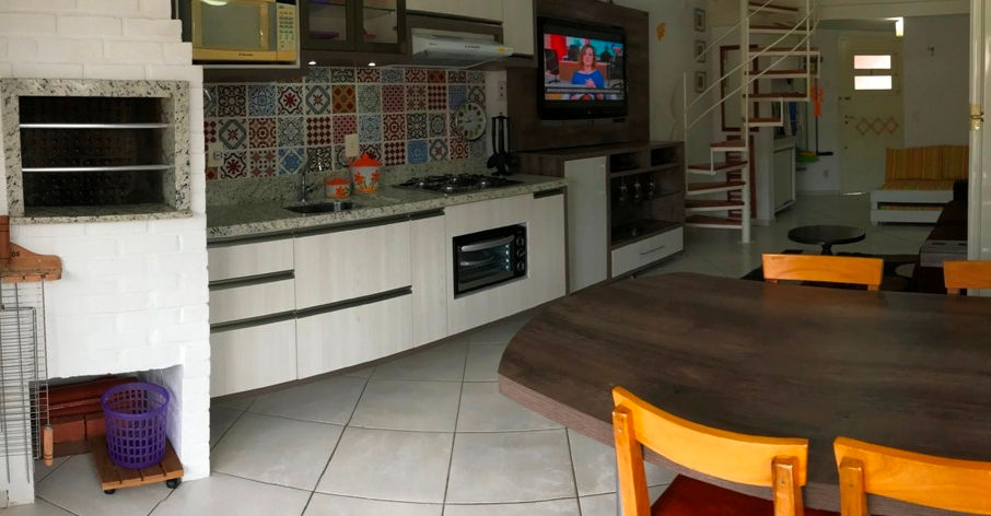 Este duplex está no primeiro piso, possui escadas externas para chegar no apartamento e escada caracol interna para acessar o mezanino onde está o dormitório de casal com ar condicionado split. A sala e cozinha são integradas e dispõem de uma bicama permitindo acomodar duas crianças, TV de 40" a cabo e ventilador. A cozinha está equipada com geladeira duplex, fogão cooktop de 4 bocas, micro-ondas, forno elétrico, utensílios básicos como talheres, pratos e copos, além de churrasqueira interna. O apartamento também oferece um banheiro e uma vaga de estacionamento descoberta para um carro, em frente ao residencial. O Residencial Atlântico Jurerê está localizado na parte leste da praia de Jurerê, a apenas 70 metros do mar!